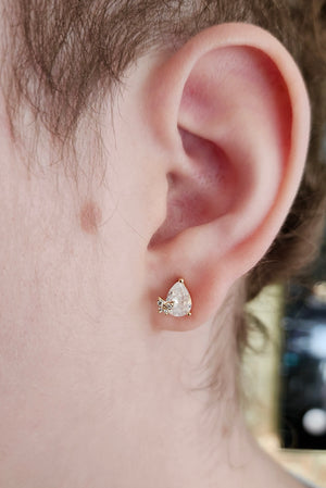 Brinco banhado a ouro, no formato de gota pequeno com as cores de zircônias no vermelho e verde disponíveis, e ao redor dessa bela zirconia várias micro zircônias cravejadas.