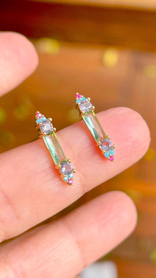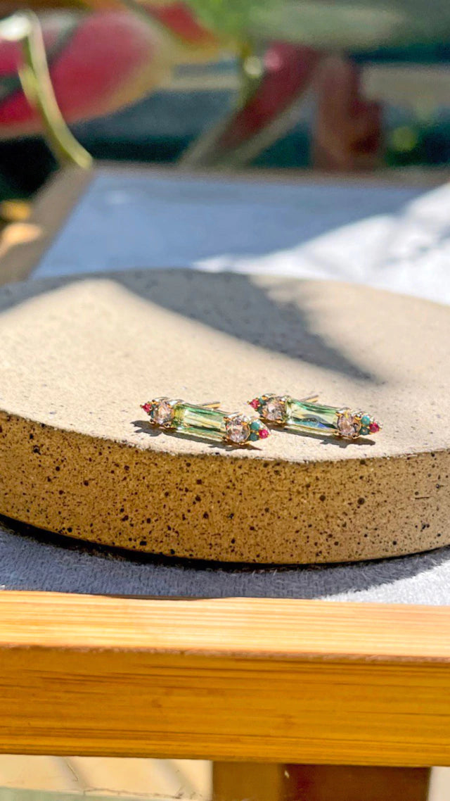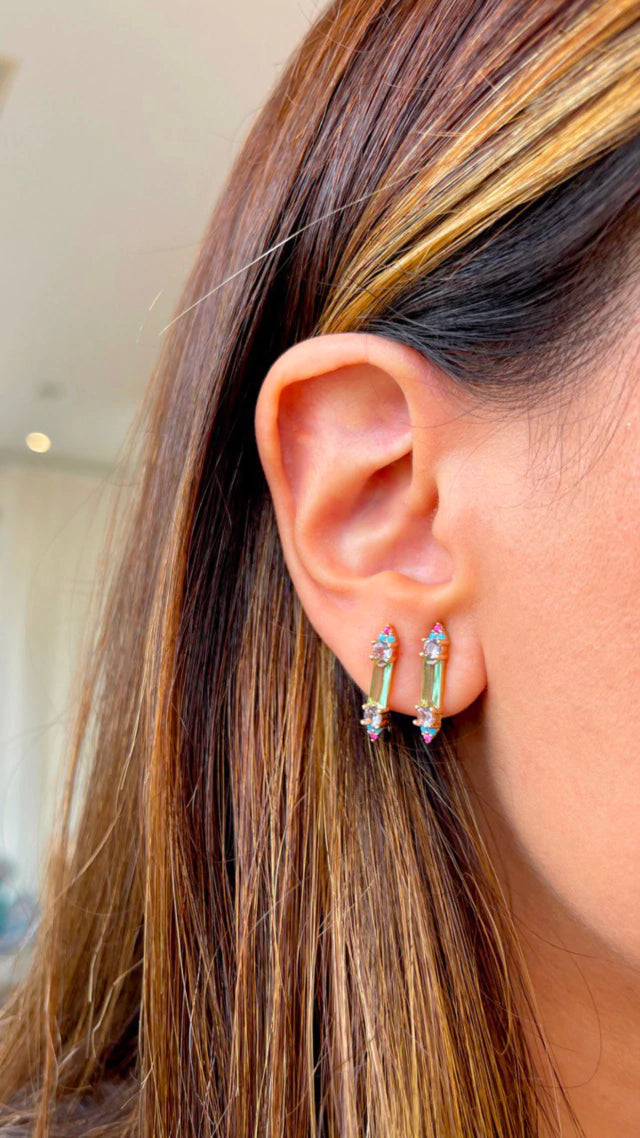 Brinco banhado a ouro no formato de bastão com uma linda zircônia verde no centro no formato retangular e outras zircônias menores na parte superior e inferior do retângulo com diversificadas cores.