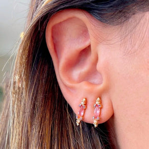 Brinco banhado a ouro, com uma linda pedra fusion turmalina no formato de um quadrado médio no centro e ao redor quanto na parte superior quanto na parte inferior linda micro zircônias coloridas cravejadas.
