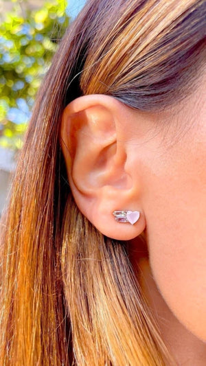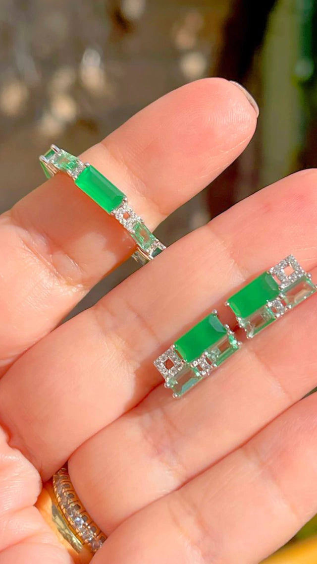Brinco no prata 925, com uma linda pedra fusion esmeralda no formato de retângulo médio e outras 2 zircônias no tom de verde mais claro no formato de retângulos entre eles dias zirconias cristais cravejadas  e em baixo um pequeno quadrado vazado todo cravejado de micro zirconais cristais.